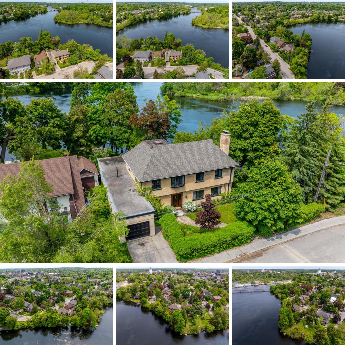 In 1926, a 30 year old, New York architect Walter Blackwell (son of famous architect William Blackwell) designed and built an Arts and Crafts Cottage on the banks of the Otonabee River just off the downtown, in Peterborough Ontario. The Sutton-Deyman designated heritage home (with a 40% tax reduction for heritage status) is a remarkably well-preserved example of the hand crafted Tudor Revival style architecture in a spectacular setting on a mature tree lined street sitting on almost 200 feet of waterfront on the Otonabee River. The view is looking north up the river with city parkland on the other side of the river. The recessed oak panel door with the original forged iron hinges, the diamond shaped leaded glass windows, the oak beamed living room ceiling and hand chiselled stone fireplace take you back to a time when hand craftmanship was an art form. The home has been carefully updated inside with period correct updates to the kitchen and bathrooms. The prairie stucco exterior is unique and in excellent condition. At almost 2600 sq feet above grade, and four bedrooms on the 2nd floor, this home easily fits a family situation. The main floor primary bedroom addition (1946) at the back of the house facing the river has an adjoining walkthrough closet and 3pc bath. A long single car garage with entrance into the house was added in 1946 as well. The concrete basement is full and high with a walk-up to the backyard for easy storage of bikes, kayaks, and outdoor furniture. The river views from the covered patio off the dining room and from the 2nd floor balcony are serene and peaceful. A one-of-a-kind home in a one-of-a-kind location is the only way to describe this timeless property. Original blueprints, recent home inspection report, heritage designation and history are available.